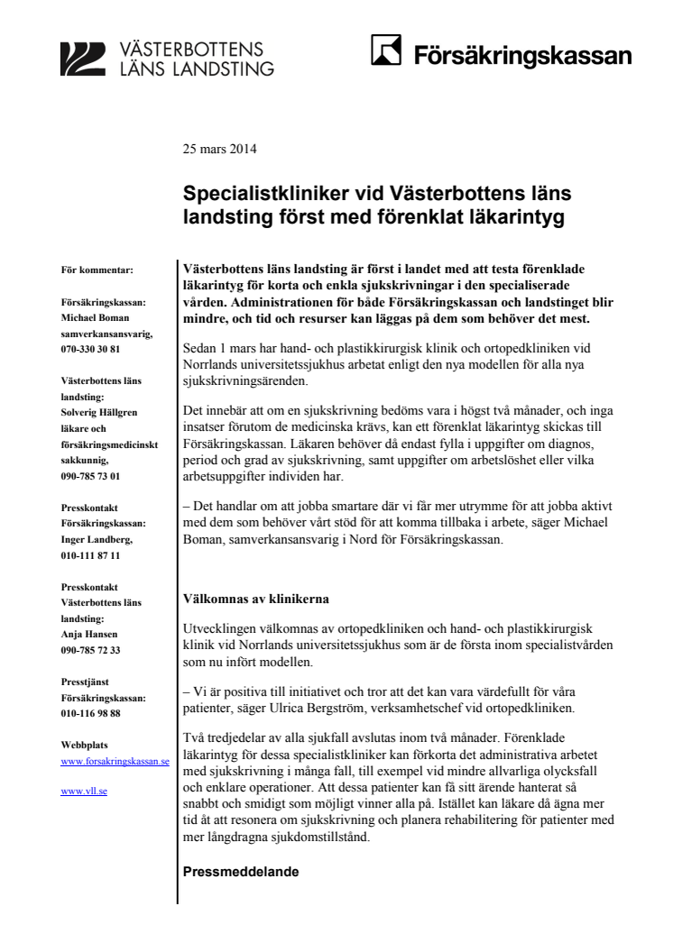 Pressmeddelande från Västerbottens läns landsting och Försäkringskassan om enklare läkarintyg för specialistkliniker, som infördes 1 mars 2014 vid hand- och plastikkirurgisk klinik och ortopedkliniken vid Norrlands universitetssjukhus.