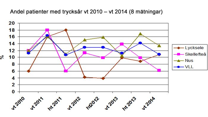 Det resultatet ska jämföras med oktober 2013 då siffran var 14,2 procent. Totalt har 624 patienter deltagit i mätningen i VLL. Den vanligaste placeringen av trycksår är vid ryggslut och häl.